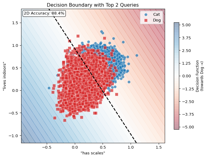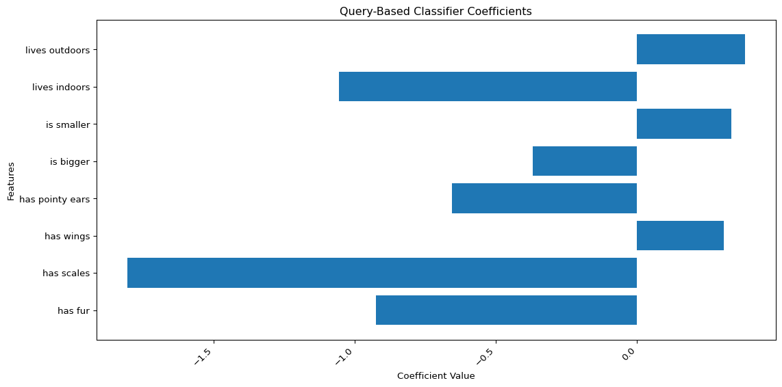 Notice now that the number of coefficients in our classifier corresponds 1:1 with the number of queries we made… And because our queries were made with natural language, we can actually interpret these coefficients in terms of their ‘importance’ in determining the correct label!