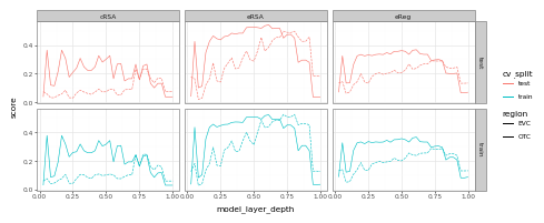 Different metrics reveal different aspects of alignment: Classical RSA provides a strict test of emergent geometric correspondence, while encoding models allow flexible feature reweighting. The choice of metric embodies assumptions about what constitutes a “good” match between model and brain.