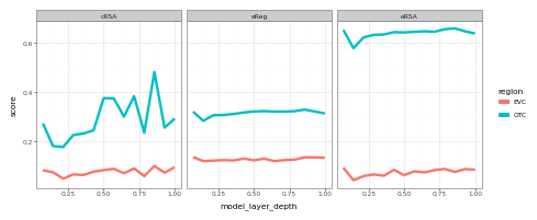 Notice here that language models do exceptionally well in predicting late-stage visual cortex (OTC), but not so well in predicting early visual cortex (EVC)! This is a nice sanity check, and suggests the high scores in late-stage visual cortex are indeed the result of shared representational structure, as opposed to a mere statistical fluke.