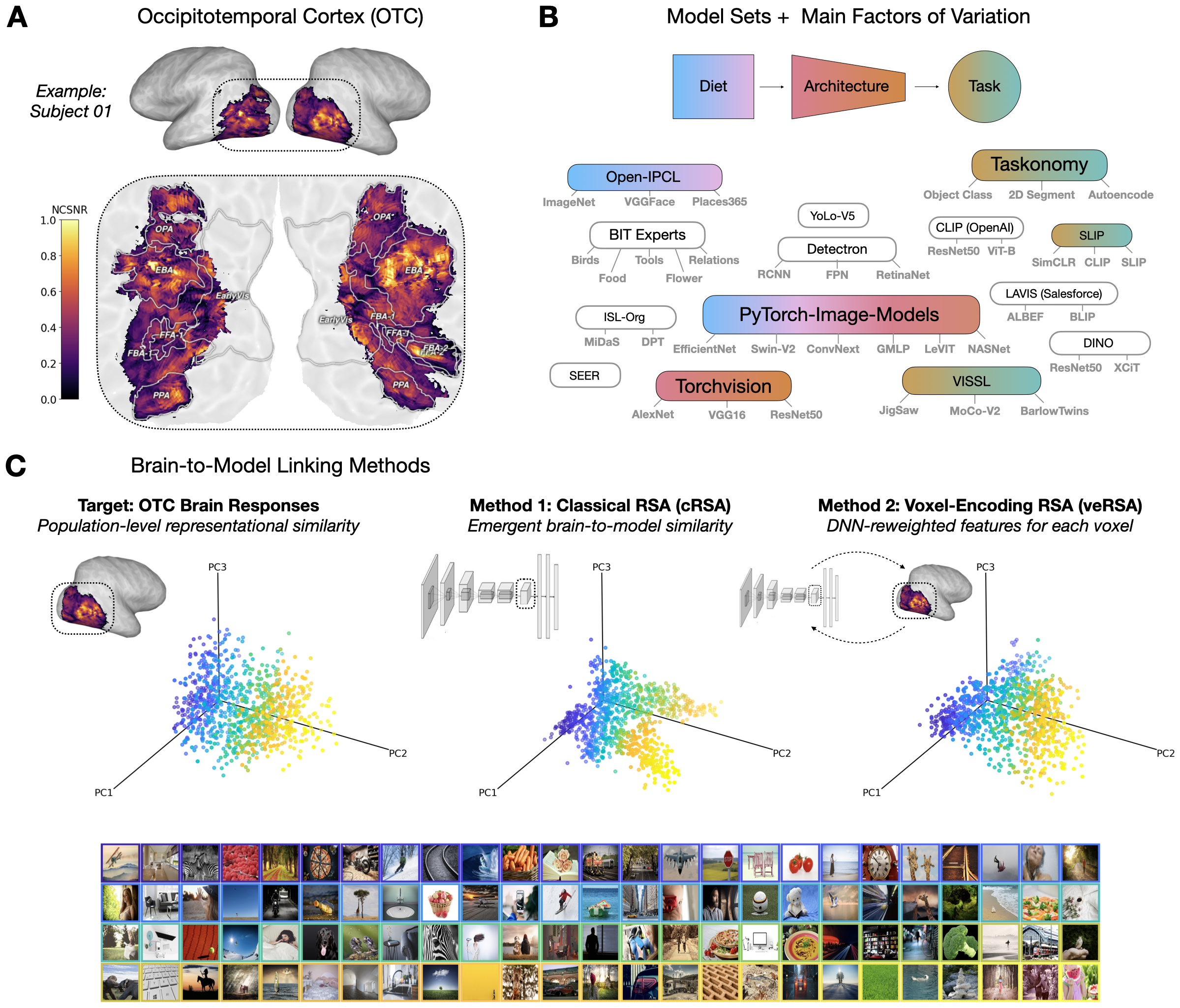 Target Brain Region: Our primary target is human occipitotemporal cortex (OTC), a broad swath of high-level ventral visual cortex encompassing category-selective regions for faces, bodies, scenes, and objects. But our interest extends beyond object recognition per se – OTC is increasingly understood as a “feature bank” whose representations support not just categorization but flexible, adaptive behavior across many tasks. The same representations that predict OTC activity may also predict human behavioral similarity judgments, generalization patterns, and semantic associations.