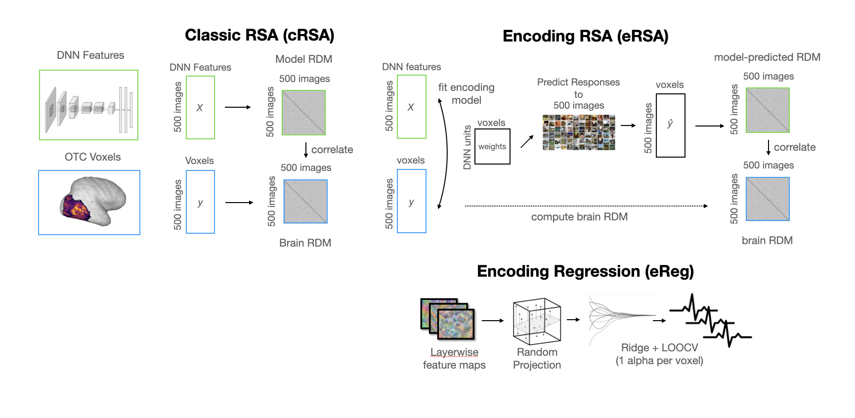 We will use both approaches, as well as hybrid methods (encoding RSA) that combine their strengths. The goal is not to find “the best” metric, but to understand what different metrics reveal about model-brain correspondence.
