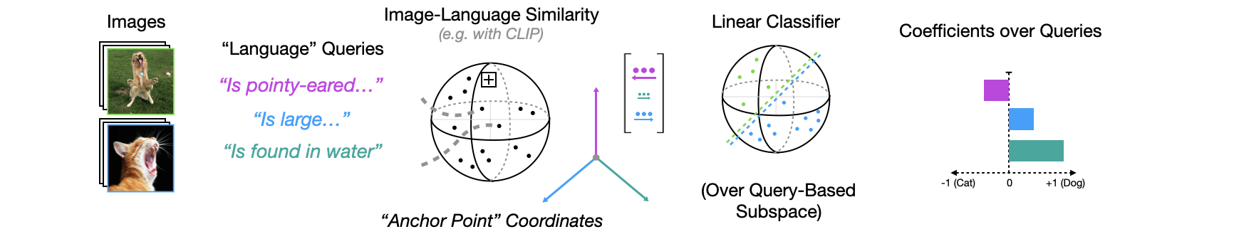 Anchor Points as a Coordinate System: Think of this as defining a new coordinate system where each axis is “similarity to anchor X.” If we choose our anchors wisely – using natural language queries that correspond to interpretable concepts – then the resulting representation is both lower-dimensional and human-readable. Each dimension has a clear meaning: “how much does this image resemble [query]?”